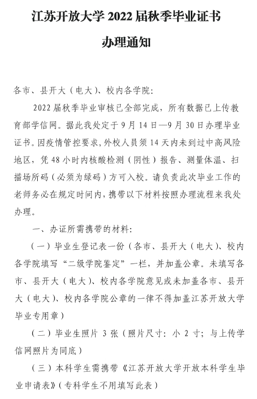 江蘇開放大學2022屆秋季畢業證書辦理通知