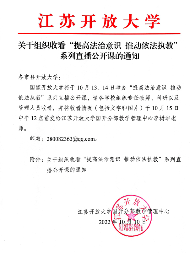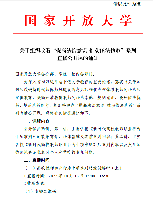關于組織收看“提高法治意識 推動依法執教”系列直播公開課的通知