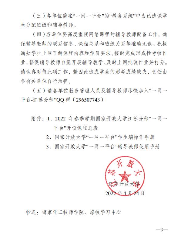 關于2022年春季學期國家開放大學江蘇分部網上教學工作安排的通知