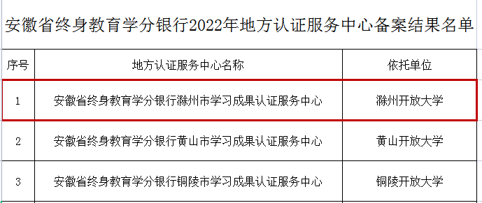 近日,安徽省教育廳印發了《關于公布2022年安徽省終身教育學分銀行認證服務中心備案結果的通知》(皖教秘〔2022〕201號),滁州開放大學獲批成為安徽省終身教育學分銀行滁州市學習成果認證服務中心,這也是安徽省首批、滁州市唯一的地方學習成果認證服務中心。