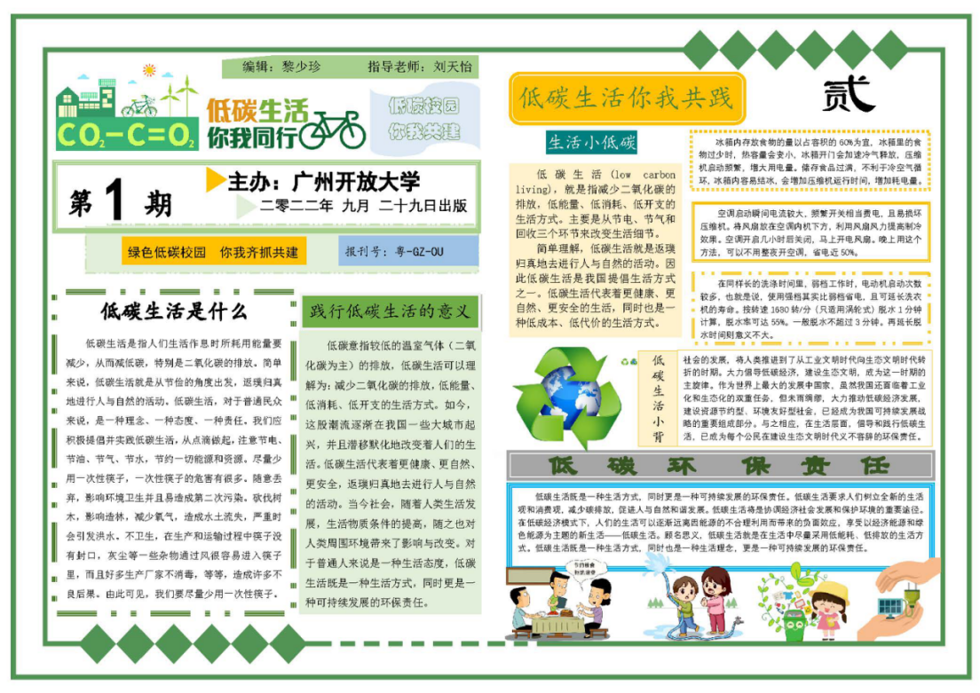 經過評選,廣州開放大學鄉村振興學院黎少珍同學的作品《低碳生活你我共踐》榮獲2022年廣州市學校“低碳校園”生態文明教育系列活動之電腦小報高校組一等獎。