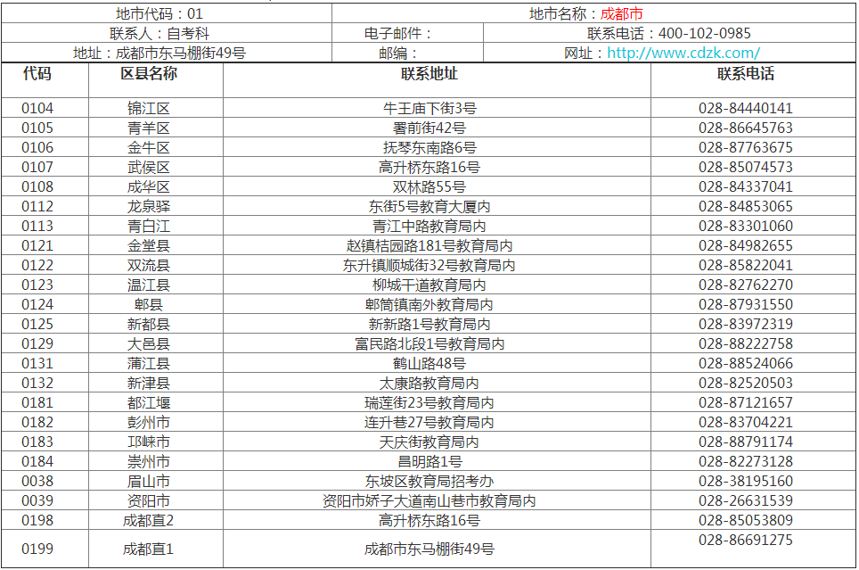 自考來臨,小編貼心的為各位同學附上成都的各地招生辦聯系方式