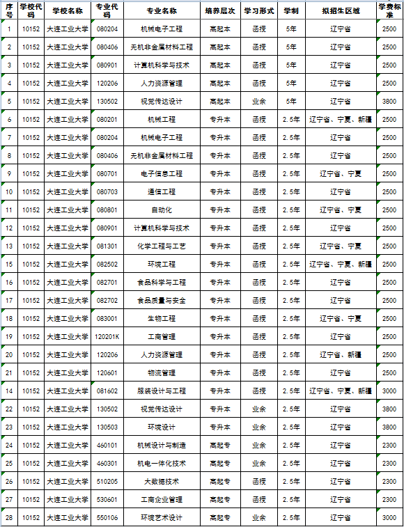 大連工業大學2022年高等學歷繼續教育擬招生專業情況匯總表