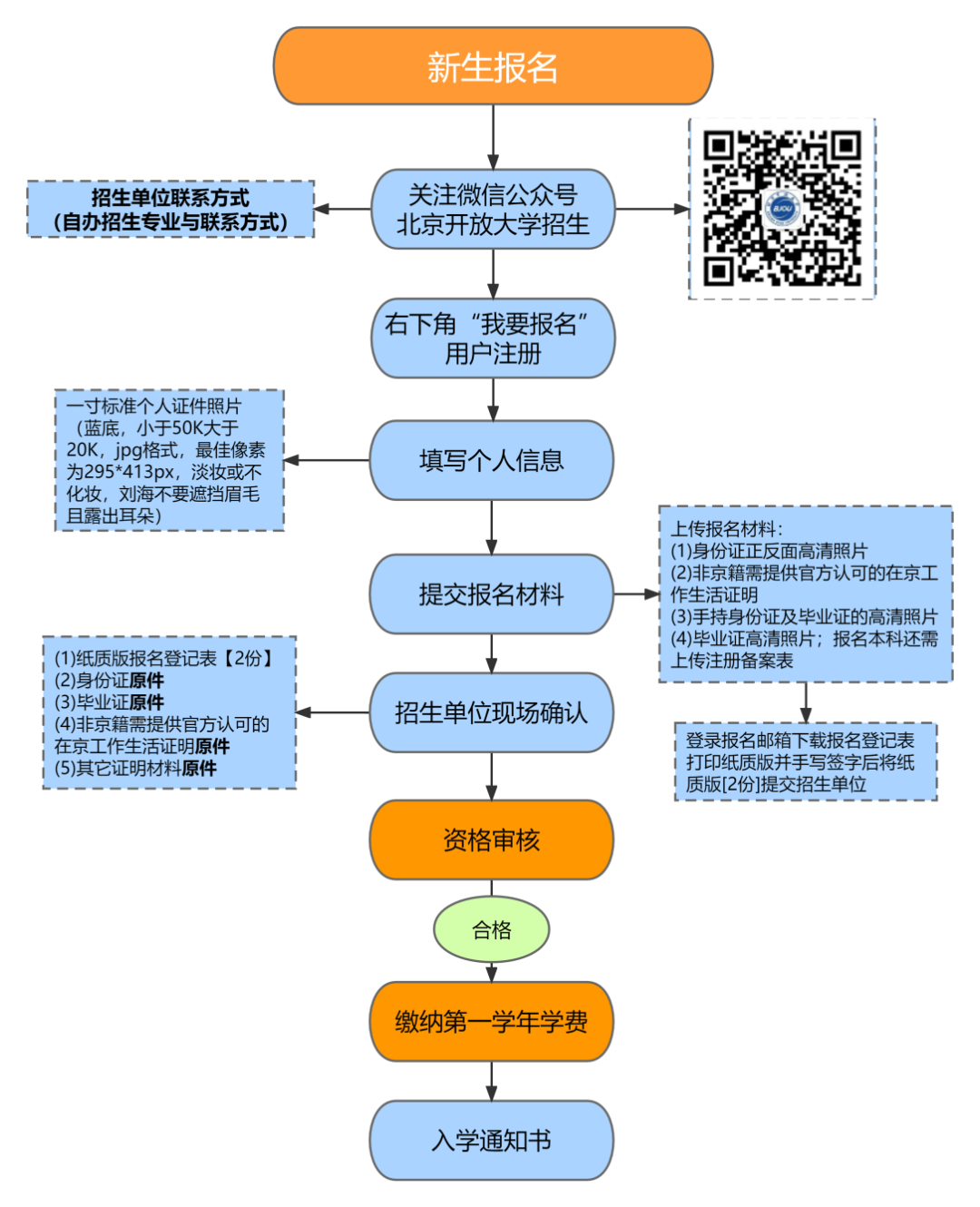 報名截止后,學習者提交的材料經由招生單位初審、北京開放大學復審(包括新生材料復審、在線復審、電話回訪等),學習者本人還需經過在線復審、繳納學費后,學校將新生數據報中國高等教育學習者信息網(學信網)電子注冊后即轉入學籍管理。