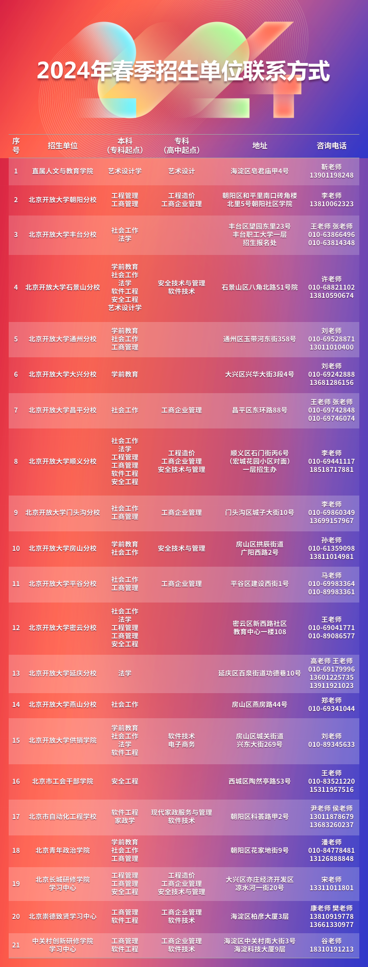 北京開放大學2024年春季招生單位自辦專業報名聯系方式