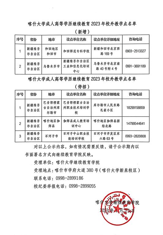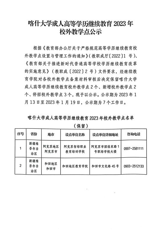 喀什大學成人高等學歷繼續教育2023年校外教學點公示