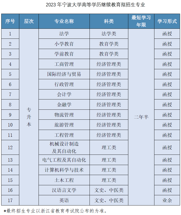 目前,寧波大學高等學歷繼續教育只招收專升本層次的學生。2023年擬招生專業見下表: