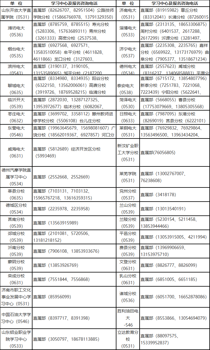 山東開放大學2023年春季開放教育學習中心及報名咨詢電話