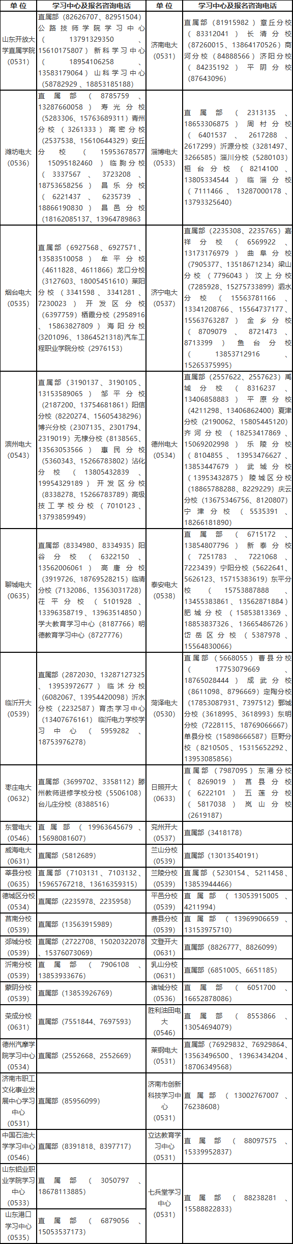 山東開放大學2023年秋季開放教育學習中心及報名咨詢電話