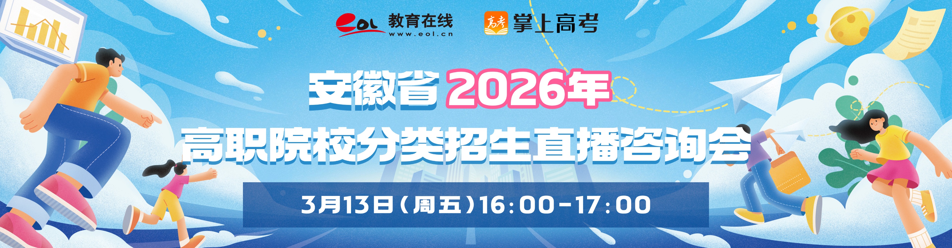 為幫助廣大考生全面了解招生院校信息,教育在線聯合掌上高考將于3月13日16點舉辦安徽省2026年高職院校分類考試招生直播咨詢會,為考生提供權威政策解讀、院校介紹,助力大家科學報考、順利圓夢,敬請關注!