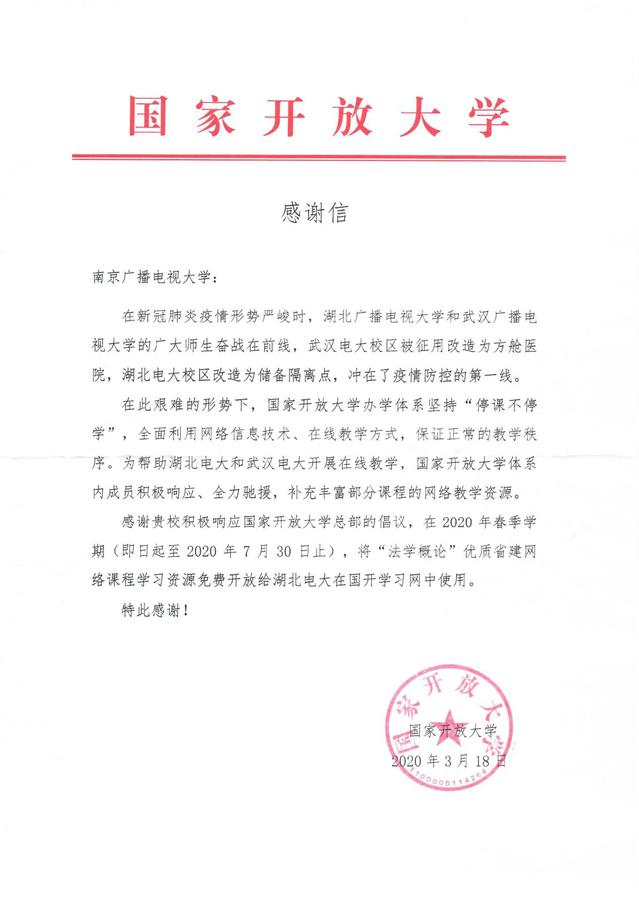 國家開放大學向我校發來感謝信