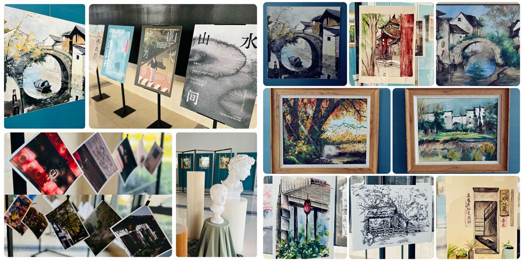 展廳布置靈動、雅致,兩條長長的帷幔拉開了采風展的序幕,展廳一側擺放的是學生的油畫作品,交錯的光影、橫斜的紋理,紛紛在顏料的暈染和筆觸中一一展現。展廳左側是學生水彩及速寫作品,一張張速寫描繪了宜興各地的風土人情;右側展出的是學生的攝影作品,駐足于此,可以發現每一幅作品其實都在講述著學生對美的理解和對生活的熱愛,點滴生活都值得用心記錄。展廳中央擺放著幾張展臺,有的是學生親手制作的紫砂作品,有的是學生自己設計的明信片,還有一張展臺是互動體驗區,上面擺放著十幾張攝影反轉片,透過陽光和其他光線可以看到不一樣的色彩效果,增強了學生體驗感和趣味性。