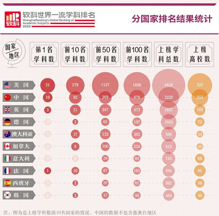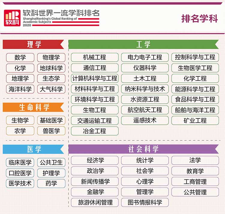 軟科今日(6月29日)正式發布2020“軟科世界一流學科排名”(ShanghaiRanking's Global Ranking of Academic Subjects)。2020年排名覆蓋54個學科,涉及理學、工學、生命科學、醫學和社會科學五大領域。