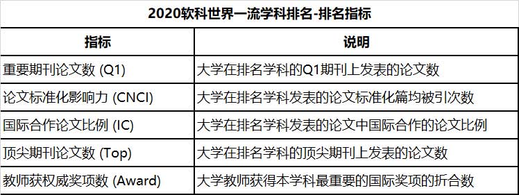 “軟科世界一流學科排名”使用一系列國際可比的客觀學術指標對全球大學在相關學科的表現進行測量,包括學科國際權威獎項、學科頂尖成果、科研質量、國際合作等。2020年,軟科對評價體系進行了優化,使用“重要期刊論文數(Q1)”代替原“論文總數(PUB)”,用于測量被評價大學在相應學科的高水平科研產出。
