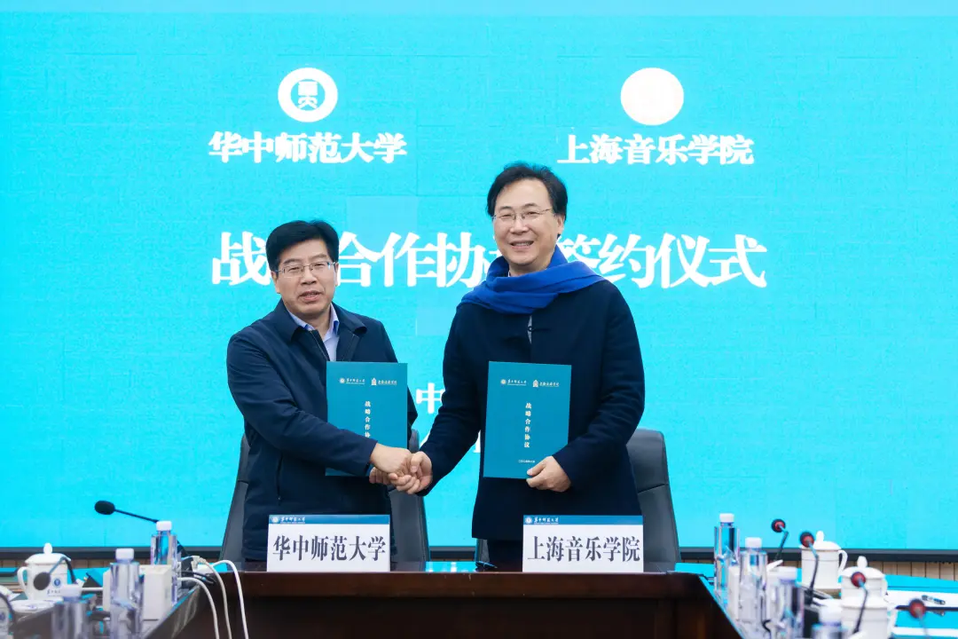 華中師范大學校長彭雙階和上海音樂學院院長廖昌永代表兩校簽署戰略合作協議。雙方決定在人才培養、學科建設、科學研究、美育育人和文化推廣等方面開展多層次、全方位、立體化的實質性合作,實現兩校的互惠共贏、相互促進和共同發展,同時也為湖北與上海兩地的文化交流與融合搭建橋梁,促進區域文化生態的多元化與繁榮發展。