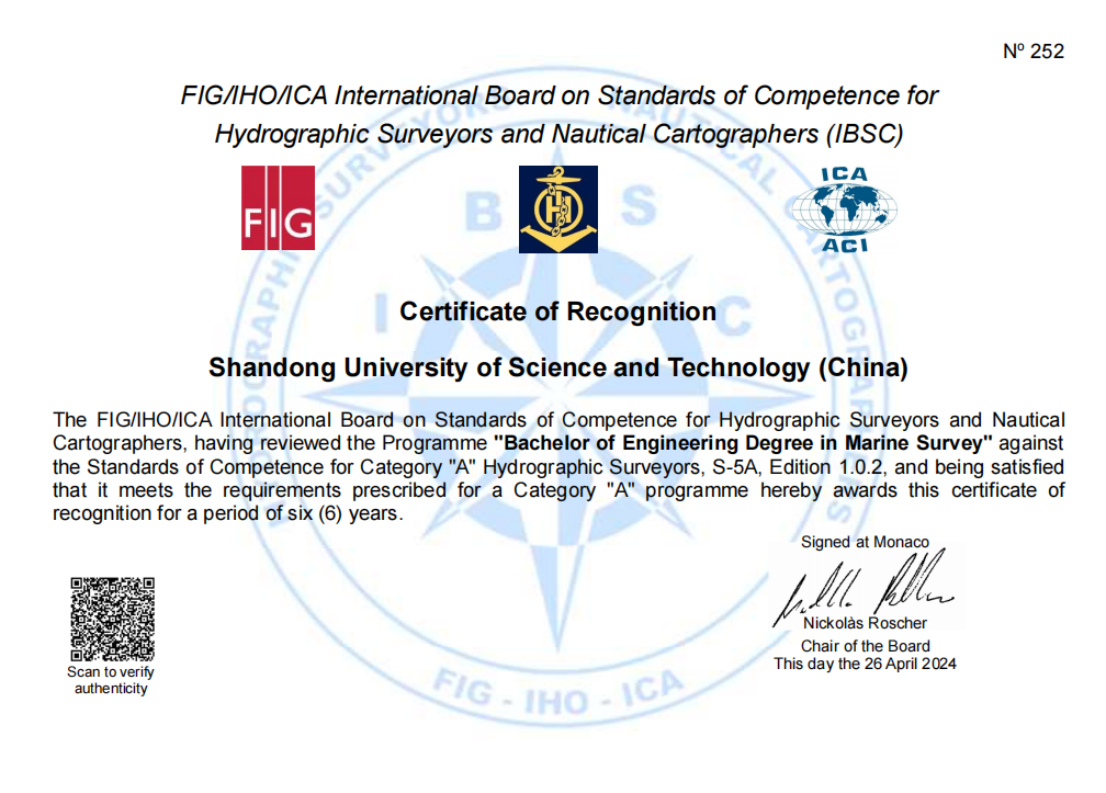 近日,由國際測量師聯合會、國際海道測量組織和國際制圖協會(FIG/IHO/ICA)聯合組成的國際海道測量師和海圖制圖師能力標準委員會(IBSC)發來函告:山東科技大學測繪與空間信息學院“海洋測繪工程工學本科專業教學計劃”獲得國際A級認證。山東科技大學成為國內非軍方高校唯一獲得該資質的單位