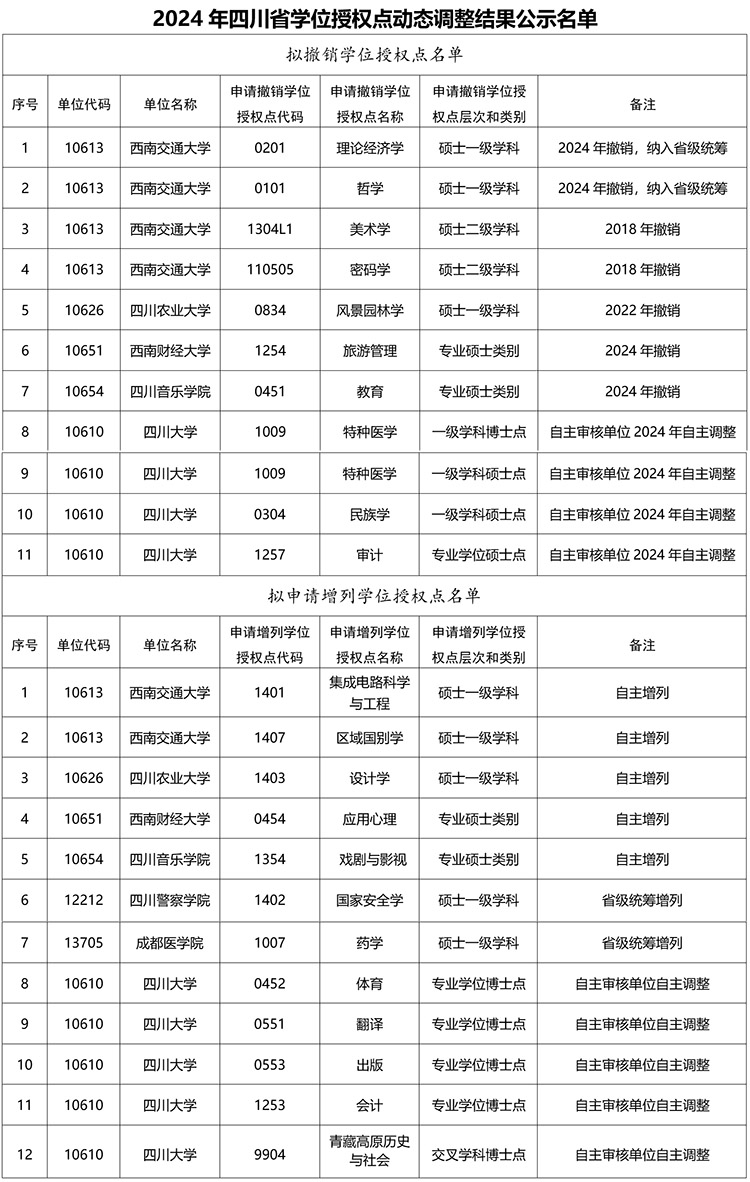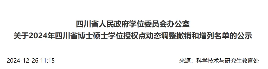 近日,四川省組織開展了2024年博士碩士學位授權學科和專業學位授權類別動態調整工作,四川省人民政府學位委員會辦公室對2024年四川省博士碩士學位授權點動態調整撤銷和增列名單進行公示。
