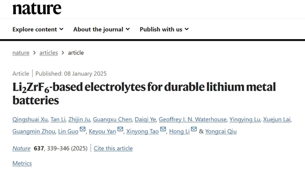 由于m-Li2ZrF6 納米顆粒的合成工藝簡單,具備大規模生產條件,為鋰金屬電池的廣泛應用提供了解決方案。研究成果歷經2年5個月的4輪審稿、修改,最終以“Li2ZrF6 basedelectrolytes for durable lithium metal batteries”(六氟鋯酸鋰基耐用型鋰金屬電池)為題發表在國際頂尖學術期刊Nature上。