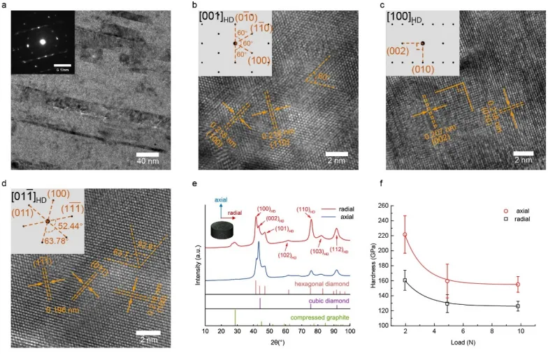 圖3. 高取向六方金剛石塊材的透射電鏡照片、XRD以及維氏硬度測試