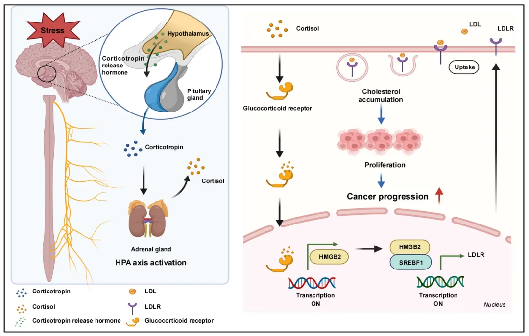 機制圖:慢性壓力通過釋放皮質醇激活GCR-HMGB2-LDLR軸,導致膽固醇代謝異常,促進ESCC的發生和發展。