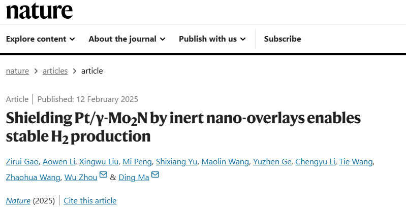 研究團隊在《Nature》雜志發表的研究成果題為“ShieldingPt/γ-Mo2N by Inert Nano-overlays Enables Stable H2 Production”,聚焦催化劑穩定性,延續了馬丁教授此前在甲醇和水重整制氫方面的研究,創新性地引入稀土元素對催化劑進行改造,開發出了一種全新且泛用的高活性產氫催化劑穩定策略。研究發現,當稀土元素存在于催化劑表面并保護住催化劑的“非界面活性位”時,催化劑的壽命得到了大幅提升。具體而言,催化劑中每個Pt原子可以產生1500萬個氫分子,這一“轉換數”整整超過了此前報道的最高記錄一個數量級。這一歷史性突破為高效、穩定的制氫技術提供了全新思路。