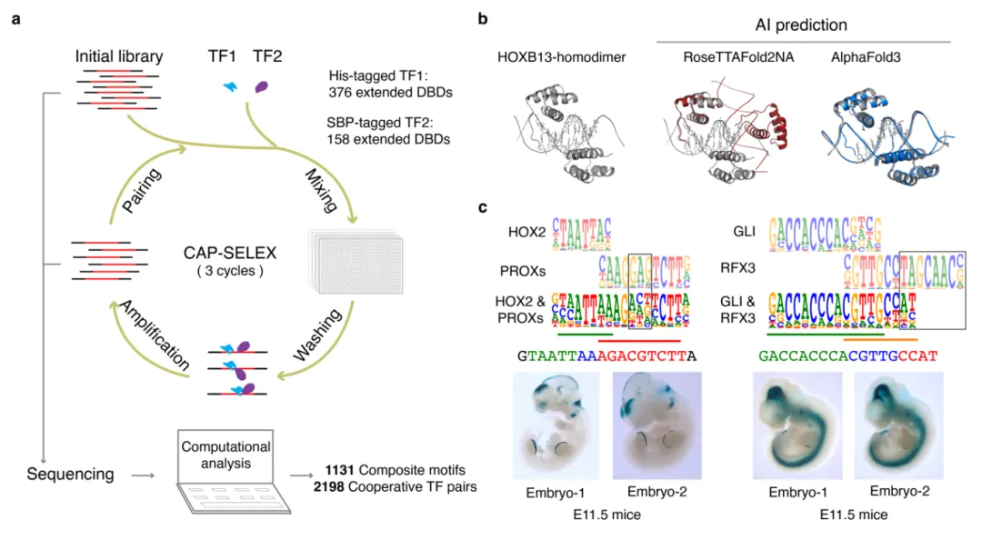 研究團隊借助于高通量篩選技術和計算生物學手段,對58000多種轉錄因子組合是否可協同結合DNA進行了系統性評估,鑒定出2198對協同作用的轉錄因子,并解析了協同作用轉錄因子識別的DNA基序(圖a)。進一步深入研究發現,轉錄因子間的協同作用目前還不能被AlphaFold等人工智能工具所預測(圖b)。因而,研究提供的迄今為止最全面的轉錄因子協同作用數據庫,以及協同作用轉錄因子識別的DNA基序庫,為科學家們深入探索轉錄因子的各種生物學功能提供了重要的數據支撐和理論依據。