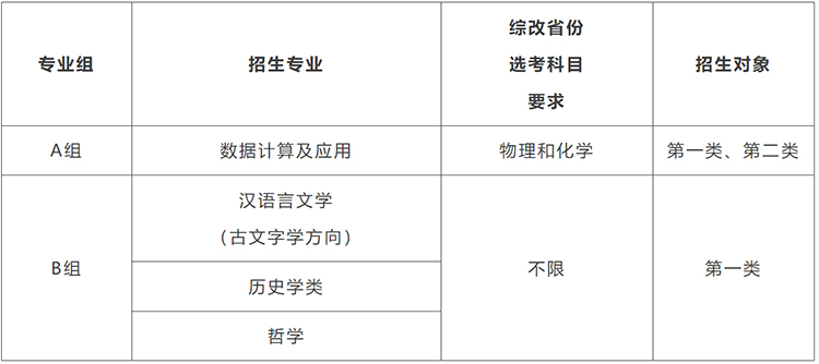 我校強基計劃招生專業為數據計算及應用、漢語言文學(古文字學方向)、歷史學類、哲學。考生可登錄報名系統查看我校2025年分省(區、市)強基計劃招生專業及招生計劃;第二類考生單列計劃。
