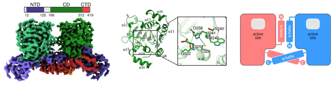 研究團隊成功表達并純化了具有活性的猴痘病毒核心蛋白酶,結合單顆粒冷凍電鏡和X射線晶體衍射技術,解析了其高分辨率的三維結構(圖1)。核心蛋白酶呈現出二體的組裝模式,每個單體包括N端結構域(N-terminal domain, NTD),催化結構域(catalytic domain, CD)和C端結構域(C-terminal domain, CTD)。活性中心位于催化結構域,包含一個催化三聯體Cys328-His241-Asp258。猴痘病毒核心蛋白酶的二體相互作用模式與其他重要人類病毒的蛋白酶不同,是核心蛋白酶結構穩定和發揮催化功能的關鍵。
