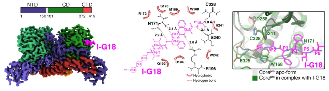 因此,為了開發更強效的新型靶向抑制劑,研究團隊開展了病毒核心蛋白酶底物識別和催化機制的研究。研究人員以核心蛋白酶一種天然底物P25K的序列為基礎,設計了一段C末端醛基取代的底物類似物I-G18。I-G18能夠與核心蛋白酶的催化中心的Cys328共價結合,模擬催化中間態的結構特征。研究團隊通過冷凍電鏡技術,解析了這一復合物的三維結構(圖2)。發現在底物的誘導下,核心蛋白酶活性中心發生一系列構象變化,在S1和S2位形成特征的狹長口袋,僅可容納P1位Gly和P2位Ala這兩個側鏈極短的氨基酸,解釋了核心蛋白酶對底物中這兩個位置氨基酸的高度選擇性。