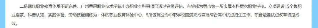 近日,廣州市教育局官網發布《2024年廣州教育工作總結和2025年工作要點》,在2024年廣州教育工作總結的“職業教育‘支撐’作用穩步提升”部分提到,廣州番禺職業技術學院申辦職業本科事項已通過省級評估,有望成為廣州市第一所市屬本科層次職業學校。