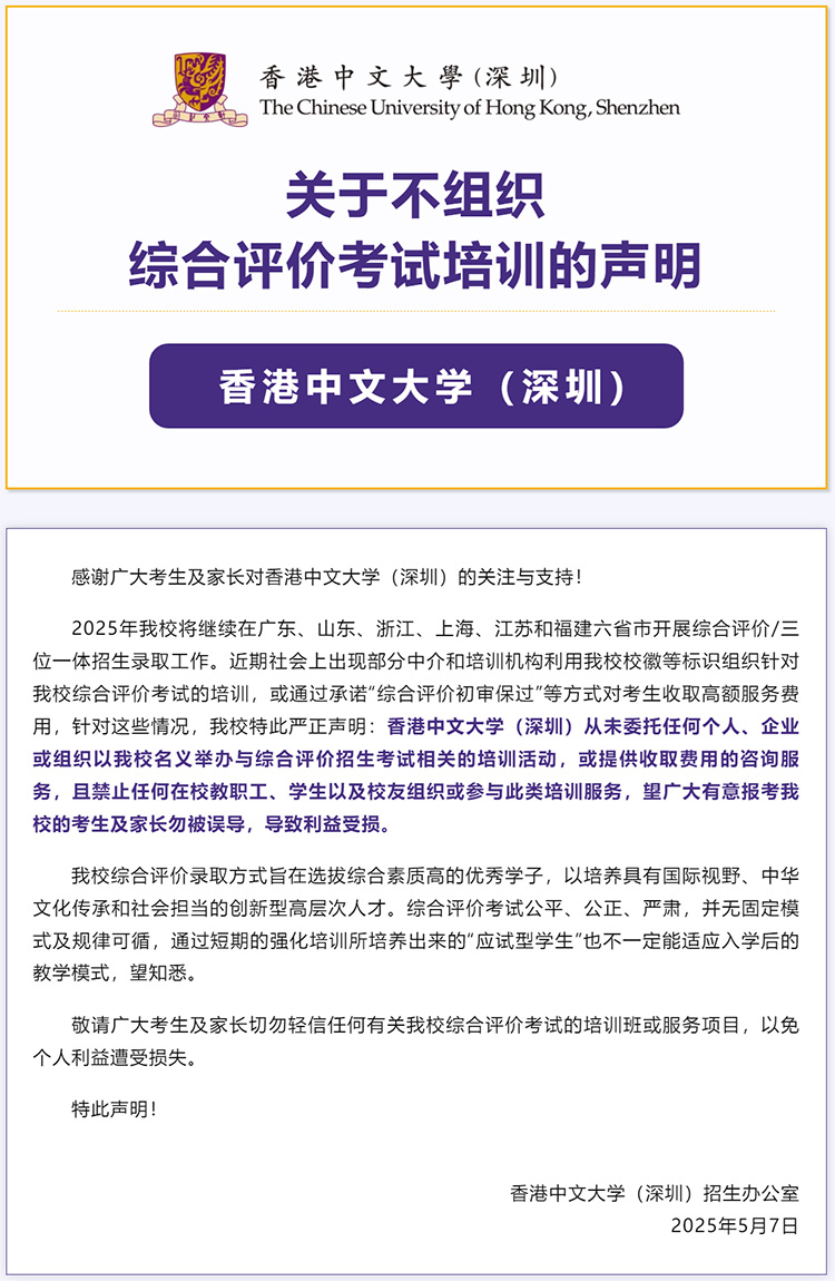 港中大(深圳)消息,近期社會上出現部分中介和培訓機構利用該校校徽等標識組織針對學校綜合評價考試的培訓,或通過承諾“綜合評價初審保過”等方式對考生收取高額服務費用。針對這些情況,5月7日,香港中文大學(深圳)發布嚴正聲明:香港中文大學(深圳)從未委托任何個人、企業或組織以學校名義舉辦與綜合評價招生考試相關的培訓活動,或提供收取費用的咨詢服務,且禁止任何在校教職工、學生以及校友組織或參與此類培訓服務。