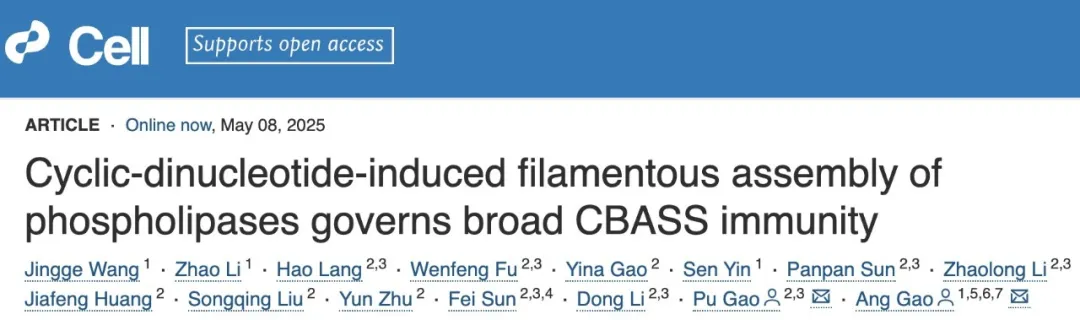 文章題為Cyclic dinucleotide-induced filamentous assembly of phospholipases governs broad CBASS immunity,揭示了CBASS系統磷脂酶類效應蛋白在響應環狀寡核苷酸分子后,自組裝形成超分子纖維結構,進而降解細菌內膜完成細胞殺傷的分子機制。這一發現不僅拓展了細菌免疫應答的多樣性,也為開發新型抗病毒策略和可控細胞裂解工具提供了理論依據。