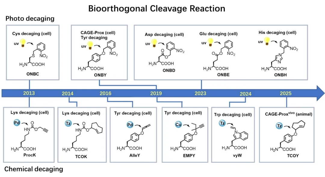 “化學脫籠”策略是一類適用性廣、干擾度低的蛋白質激活方法,通過對酶的關鍵催化殘基的保護和脫保護,可以實現對其活性的“關-開”調控。陳鵬課題組先后在賴氨酸、酪氨酸等活性氨基酸側鏈上實現了生物正交斷鍵反應和脫籠,在活細胞及活體動物內實現了蛋白激酶等多種蛋白質的特異激活。