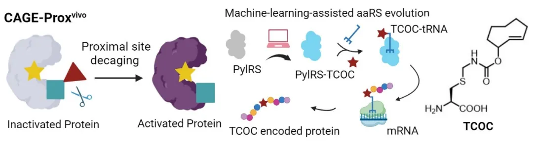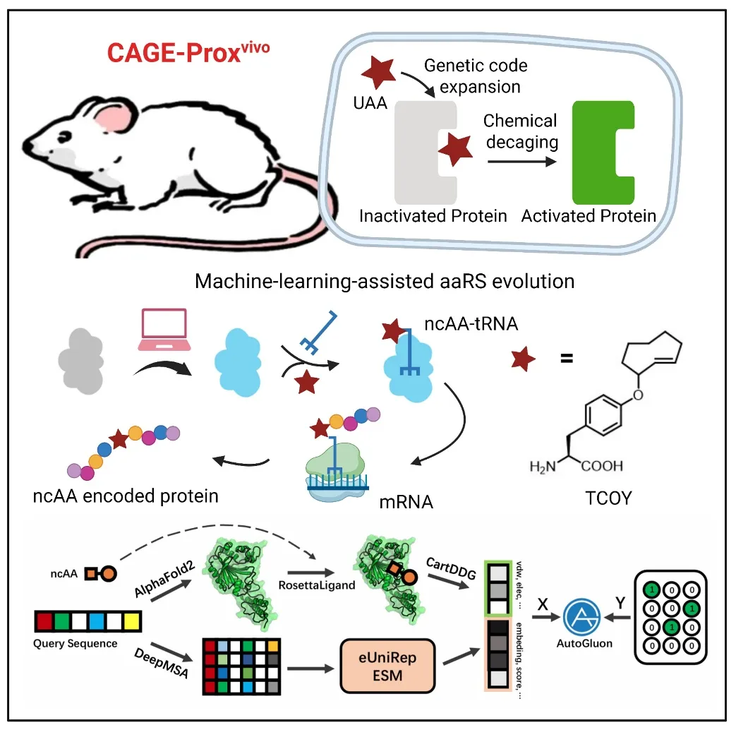 機器學習模型成功進化出可識別反式環辛烯-半胱氨酸(TCOC)的PylRS變體,并通過CAGE-Proxvivo策略實現了半胱氨酸的可控化學遮蔽以及活體內蛋白功能的精準調控