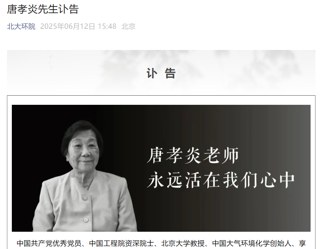 6月12日,北京大學環境科學與工程學院公眾號發布訃告:中國共產黨優秀黨員、中國工程院資深院士、北京大學教授、中國大氣環境化學創始人、享有國際盛譽的環境科學家與大氣化學家唐孝炎先生因病醫治無效,于2025年6月11日16時在北京逝世,享年93歲。