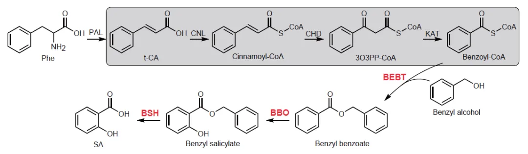 張躍林團隊采用多學科攻堅策略,結合化學遺傳篩選、轉錄組學、CRISPR基因編輯及精準代謝分析,在本氏煙草中成功捕捉到PAL途徑的全貌。研究揭示了一條意想不到的三步酶促反應(圖1):(1)酯化啟動:苯甲酰輔酶A:苯甲醇苯甲酰轉移酶(BEBT)催化苯甲酰輔酶A與苯甲醇結合,生成苯甲酸芐酯。(2)羥基化轉化:苯甲酸芐酯氧化酶(BBO)對苯甲酸芐酯進行羥基化,生成水楊酸芐酯。(3)水解釋放:水楊酸芐酯水解酶(BSH)裂解水楊酸芐酯,最終釋放出水楊酸(SA)。
