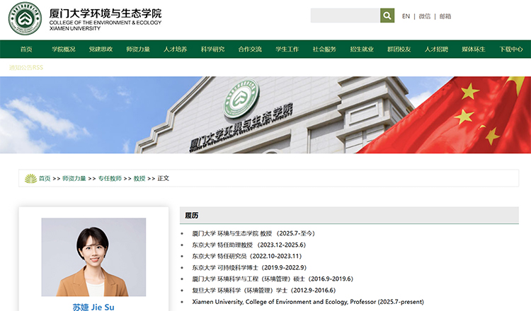 8月7日,廈門大學環境與生態學院官網顯示,蘇婕已任廈門大學環境與生態學院教授、博導。此前,蘇婕為東京大學特任助理教授。