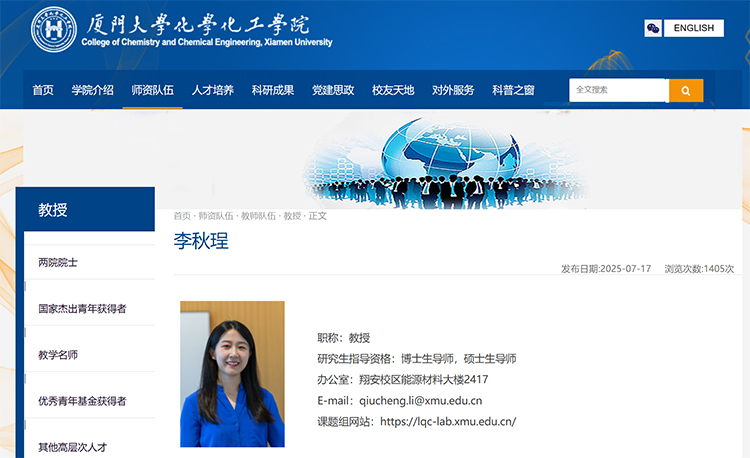 據廈門大學化學化工學院官網資料,此前擔任西湖大學工學院特聘研究員的李秋珵,已于近期加盟廈門大學,擔任廈門大學化學化工學院教授、博士生導師。