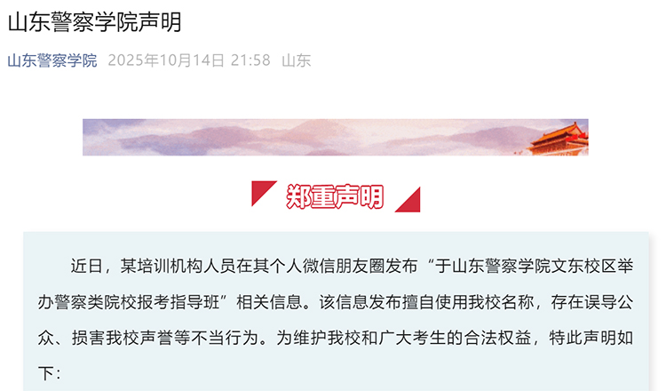 近日,某培訓機構人員在其個人微信朋友圈發布“于山東警察學院文東校區舉辦警察類院校報考指導班”相關信息。該信息發布擅自使用我校名稱,存在誤導公眾、損害我校聲譽等不當行為。為維護我校和廣大考生的合法權益,特此聲明如下: