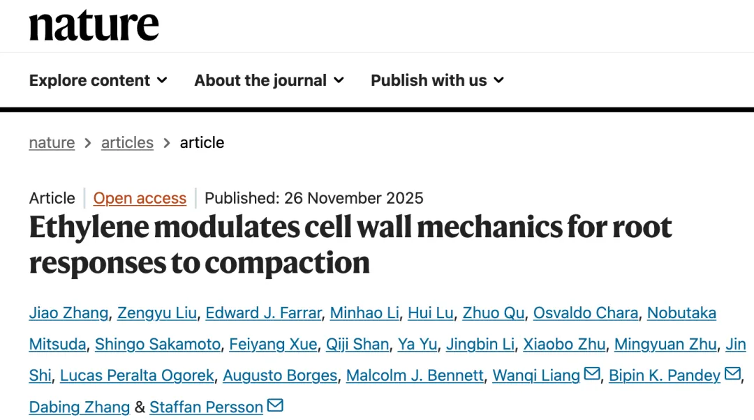 近日,上海交通大學生命科學技術學院張大兵和梁婉琪教授團隊聯合丹麥哥本哈根大學Staffan Persson教授團隊、英國諾丁漢大學Malcolm J. Bennett教授團隊在國際學術期刊《自然》(Nature)上發表題為“Ethylene modulates cell wall mechanics for root responses to compaction”的最新研究,首次揭示了植物根系利用工程學原理適應板結土壤:通過主動響應積累的乙烯,精細調控細胞壁厚度,從而促進根系增粗,提高穿透能力以適應土壤板結。