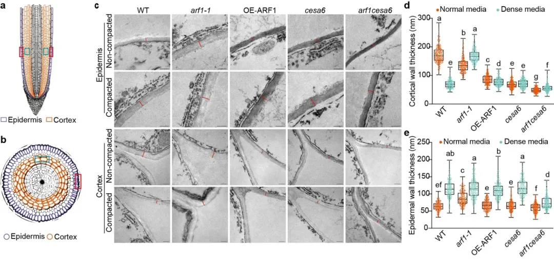 實驗驗證了這一機制的精確性:缺失OsARF1的突變體(arf1-1)皮層細胞壁始終"厚重",無法膨脹;而過量表達OsARF1(OE-ARF1)和纖維素合成酶突變體(cesa6)則形成"薄軟"皮層,可自由膨脹穿透板結層。