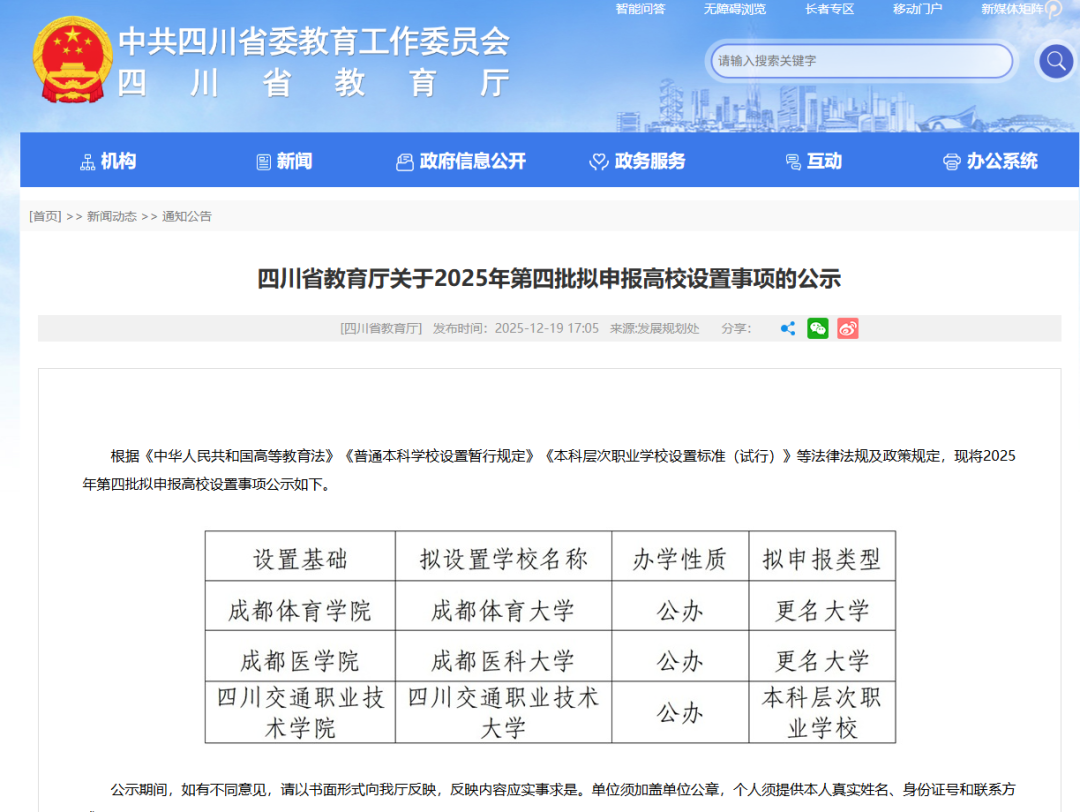 12月19日,四川省教育廳發布《關于2025年第四批擬申報高校設置事項的公示》。
