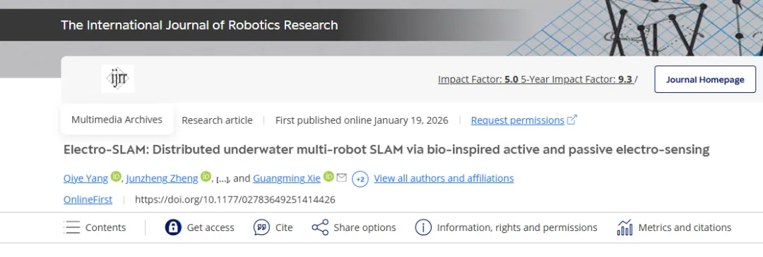 近日,北京大學先進制造與機器人學院謝廣明團隊在機器人領域國際頂級期刊The International Journal of Robotics Research(IJRR)上發表重要研究成果,提出Electro-SLAM——一種集成主動與被動電感知的分布式水下同步定位與建圖(SLAM)系統。該研究為復雜、黑暗及渾濁水域中的水下機器人自主感知與協同作業提供了全新解決方案。該期刊是機器人領域公認的國際頂級學術期刊之一。該論文是北京大學作為第一完成單位在IJRR發表的首篇研究論文,標志著學校在水下機器人與新型感知SLAM研究方向取得重要突破。