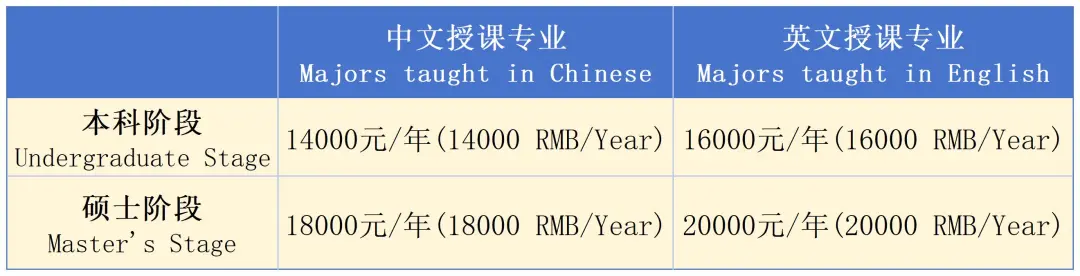 At the undergraduate level, English-taught programs cost 16,000 RMB a year, and Chinese-taught ones 14,000 RMB a year. For master’s programs, English-taught tuition is 20,000 RMB a year, and Chinese-taught is 18,000 RMB a year, below the national average.
