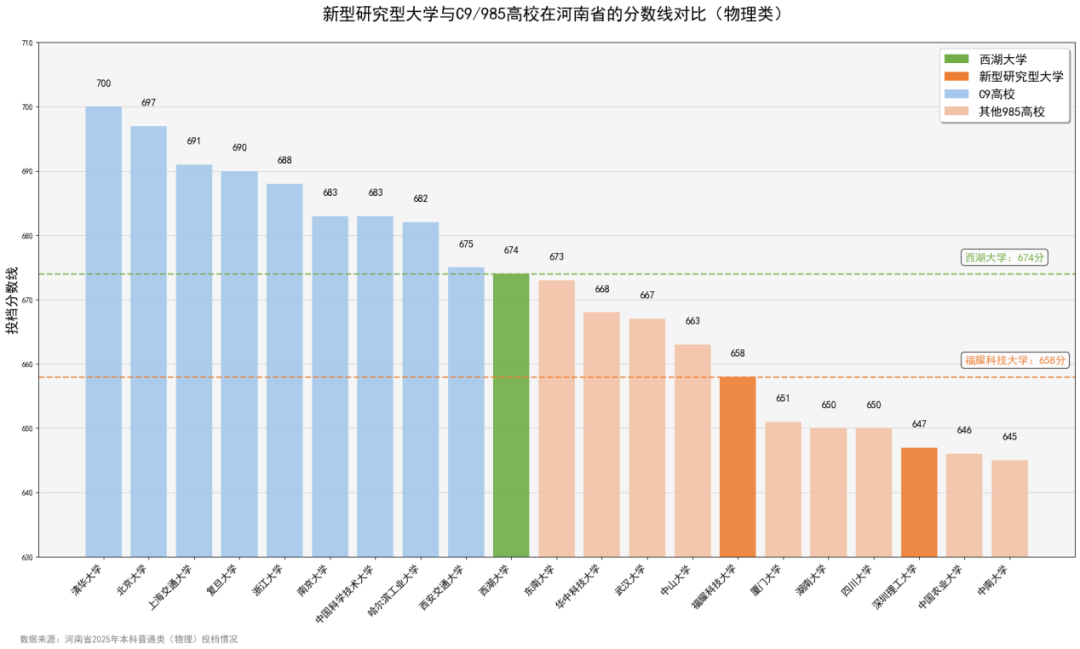 新型研究型大學與C9/985高校在河南省2025年本科普通類(物理)分數線對比圖