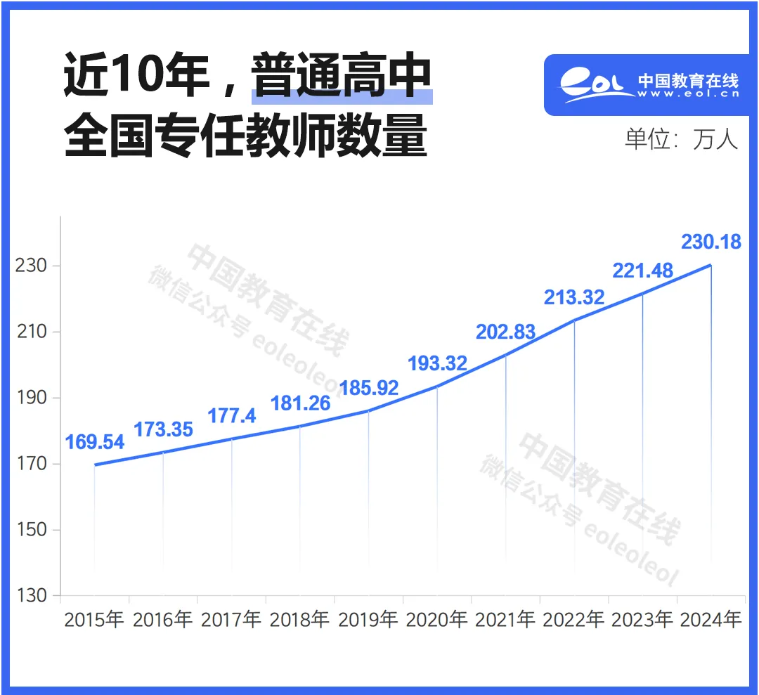 十年來,我國普通高中專任教師總數穩步上漲。從2015年的169.54萬,至2024年的230.18萬,普通高中教師增加了60多萬人。