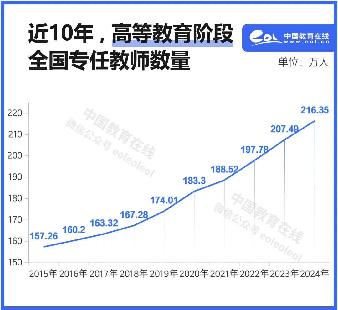 十年來,高等教育教師總數持續上漲。從2015年的157.26萬,至2024年的216.35萬,增加了近60萬人。