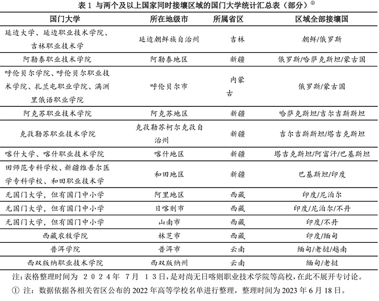 國門歷久便是國與國之間文教互動、人員互訪、貿易互聯的重要通道所在。而以學校為載體而生發和承載的文教交互,則是國境區域各類交互中影響最為持久和深遠的。客觀來看,我國的國門區域也是接壤國的國門區域。現實中,多所國門大學所處州市同時和多個國家接壤,普遍存在與多個國家同時形成交互往來的情形。典型的如延邊大學位居吉林省延邊朝鮮族自治州,東與 俄羅斯濱海邊疆區接壤,南隔圖們江與朝鮮咸鏡北道、兩江道相望,早在1989年便與朝鮮的金日成綜合大學建立了交流合作關系,當前更是與毗鄰的韓國80余所高校開展交流合作,形成了區域性的國門教育高地;喀什大學位居新疆喀什地區,和塔吉克斯坦、阿富汗、巴基斯坦3國同時接壤,先后與巴基斯坦戰略研究中心、巴基斯坦國防大學、巴基斯坦科技大學等20余所高校和國家智庫建立了交流合作關系,形成了中巴經濟走廊建設的積極助推;普洱學院位居云南省普洱市,和緬甸、老撾、越南3國同時接壤,長期堅持面向瀾湄流域開放辦學,老撾留學生人數居全國前列,對中老鐵路沿線的文教輻射和國家軟實力輸出貢獻了積極的力量。依托這些國門學校,相關區域在客觀上形成了我國文教事業“一對二”乃至“一對多”的窗口示范。故從這個意義上看,各類國門學校理應在相關區域的國際間政治、經濟,尤其是文教事業交互上做到“出得去、守得住、進得來”,既可持續推動我國教育文化科技等事項的“走出去”,也能在文教交互上拱衛我們自己的“精神領土”,同時還能吸引接壤國家和毗鄰地區的先進事項和文明成果,在發展定位上切實擔負起國家外向交往的窗口效用和示范效用。詳如表1所示: