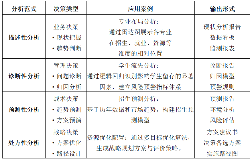 其三,院校研究分析范式逐步實現專業化進階。從描述性分析、診斷性分析,到預測性分析與處方性分析,院校研究人員協同技術人員通過學業預警模型構建、招生預測系統開發、資源優化算法設計等實踐項目,在解決實際問題中實現分析能力的持續進階。
