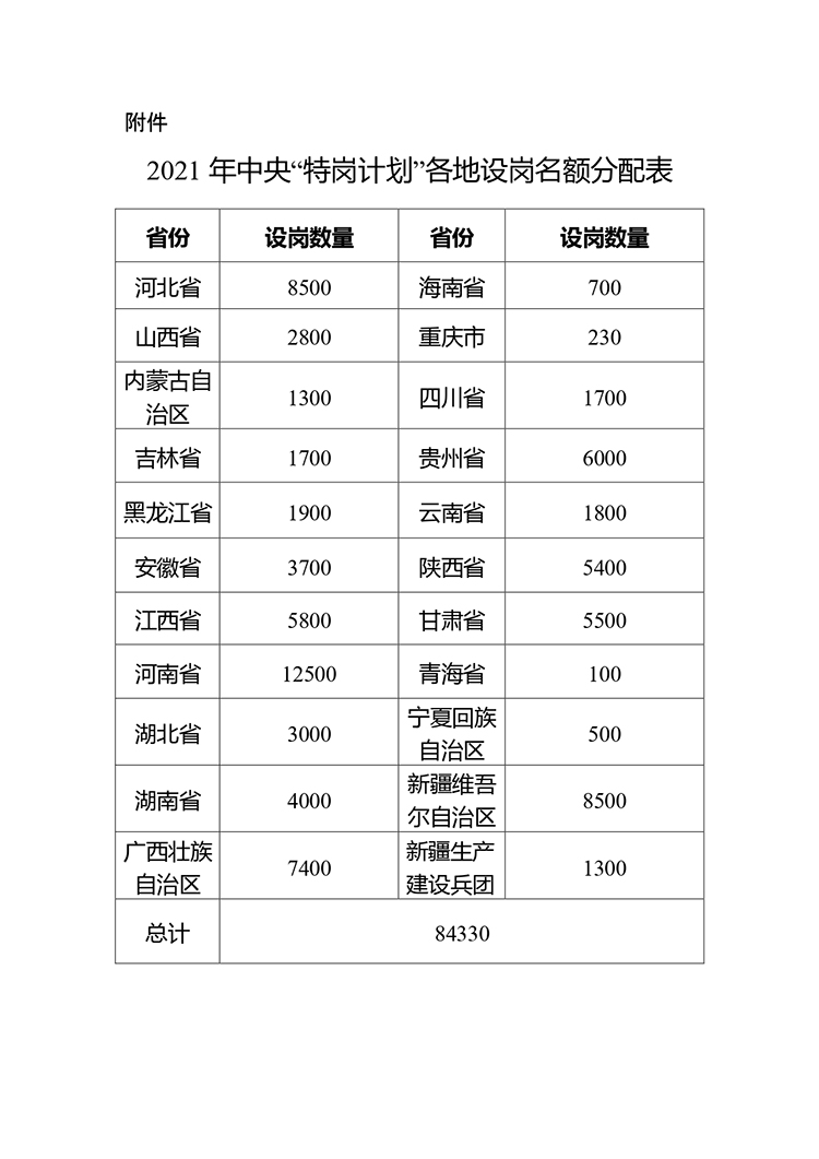 為加強新時代鄉村教師隊伍建設,鞏固拓展脫貧攻堅成果,全面推進鄉村振興,近日,教育部辦公廳、財政部辦公廳印發《關于做好2021年農村義務教育階段學校教師特設崗位計劃實施工作的通知》(教師廳〔2021〕1號,以下簡稱《通知》),全國計劃招聘特崗教師84330名。